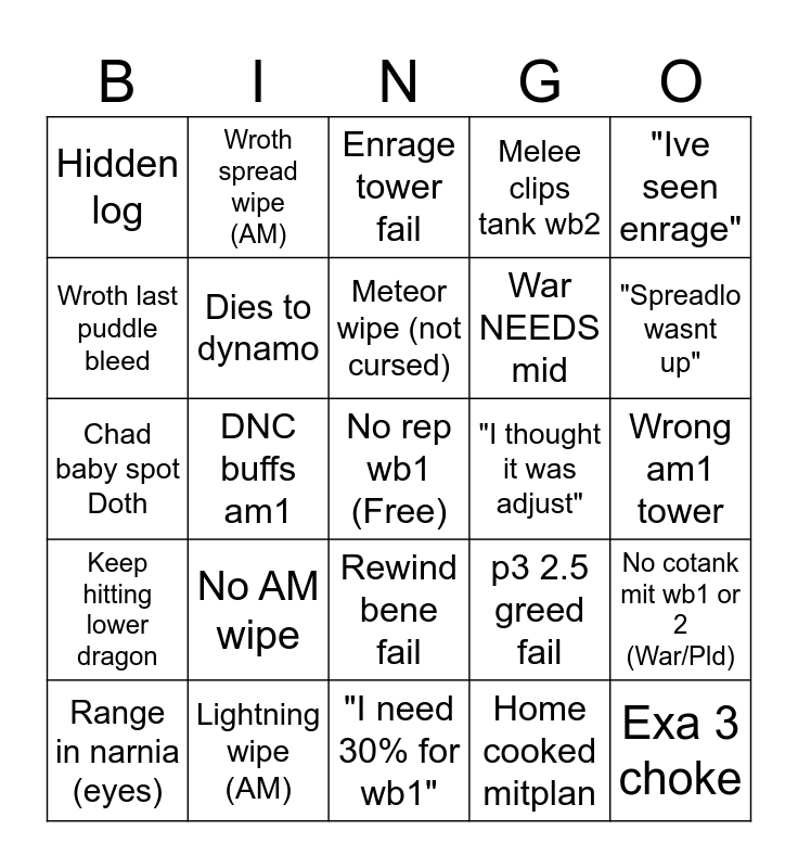 This bingo card has a free space and 24 words: No AM wipe, Lightning wipe (AM), Meteor wipe (not cursed), Range in narnia (eyes), "Ive seen enrage", Hidden log, Wroth last puddle bleed, Wroth spread wipe (AM), "I thought it was adjust", Rewind bene fail, War NEEDS mid, Chad baby spot Doth, p3 2.5 greed fail, No cotank mit wb1 or 2 (War/Pld), Dies to dynamo, Home cooked mitplan, Wrong am1 tower, Enrage tower fail, "Spreadlo wasnt up", DNC buffs am1, Exa 3 choke, Keep hitting lower dragon, Melee clips tank wb2 and "I need 30% for wb1".