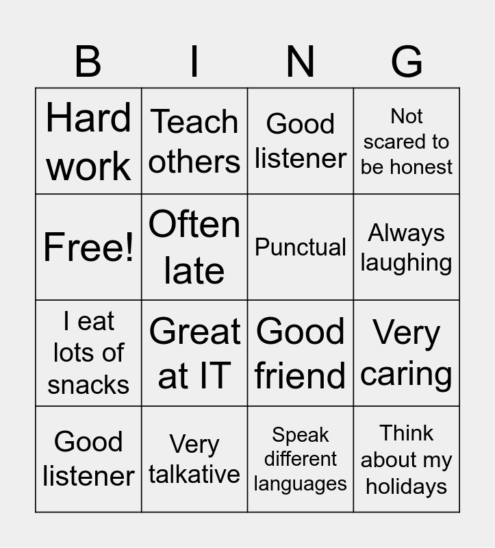This bingo card has 16 words: Very talkative, Very caring, Good listener, Hard work, I eat lots of snacks, Teach others, Good friend, Speak different languages, Free!, Often late, Good listener, Not scared to be honest, Great at IT, Always laughing, Punctual and Think about my holidays.