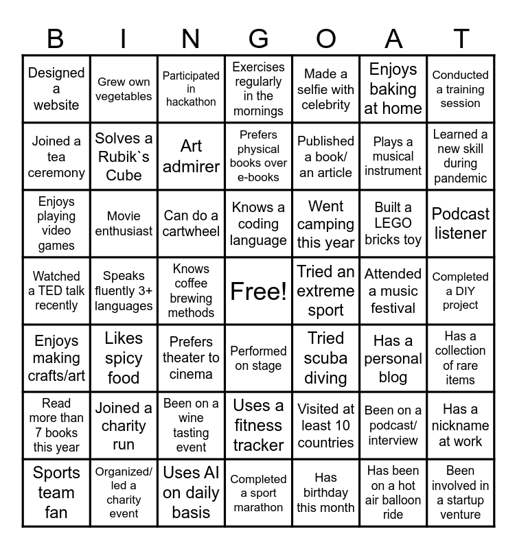 This bingo card has a free space and 48 words: Visited at least 10 countries, Plays a musical instrument, Completed a sport marathon, Speaks fluently 3+ languages, Can do a cartwheel, Completed a DIY project, Grew own vegetables, Organized/ led a charity event, Enjoys baking at home, Performed on stage, Conducted a training session, Exercises regularly in the mornings, Built a LEGO bricks toy, Went camping this year, Read more than 7 books this year, Attended a music festival, Joined a tea ceremony, Learned a new skill during pandemic, Been on a podcast/ interview, Made a selfie with celebrity, Published a book/ an article, Knows coffee brewing methods, Designed a website, Solves a Rubik`s Cube, Has a nickname at work, Art admirer, Podcast listener, Sports team fan, Knows a coding language, Movie enthusiast, Has been on a hot air balloon ride, Tried an extreme sport, Has a collection of rare items, Joined a charity run, Watched a TED talk recently, Tried scuba diving, Has a personal blog, Enjoys playing video games, Prefers theater to cinema, Been on a wine tasting event, Enjoys making crafts/art, Been involved in a startup venture, Participated in hackathon, Uses AI on daily basis, Prefers physical books over e-books, Uses a fitness tracker, Likes spicy food and Has birthday this month.