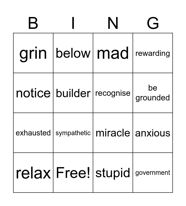 This bingo card has 24 words: typical, tough, be grounded, rescue, notice, grin, builder, below, Free!, weird, exhausted, miracle, skill, wreck, recognise, impress, stupid, mad, sympathetic, anxious, relax, government, rewarding and Stack shelves.