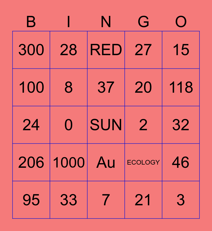 This bingo card has 25 words: 206, 33, SUN, 21, 15, 300, 28, RED, 2, 46, 100, 8, 7, ECOLOGY, 118, 95, 0, 37, 20, 32, 24, 1000, Au, 27 and 3.