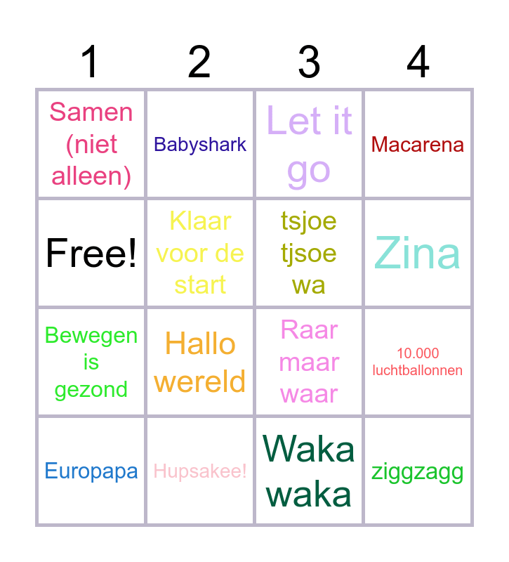 This bingo card has 16 words: Hupsakee!, 10.000 luchtballonnen, Let it go, Samen (niet alleen), Bewegen is gezond, Babyshark, Raar maar waar, Waka waka, Free!, Klaar voor de start, Europapa, Macarena, Hallo wereld, Zina, tsjoe tjsoe wa and ziggzagg.