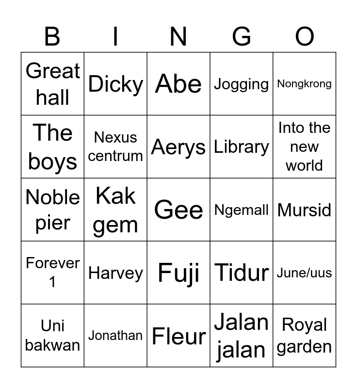 This bingo card has a free space and 24 words: Harvey, Jonathan, Aerys, Uni bakwan, Nongkrong, Great hall, The boys, Dicky, Ngemall, Fuji, Library, Noble pier, Tidur, June/uus, Nexus centrum, Jalan jalan, Mursid, Abe, Into the new world, Kak gem, Royal garden, Forever 1, Jogging and Fleur.