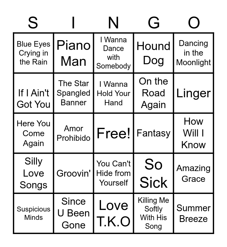 This bingo card has a free space and 29 words: Suspicious Minds, Breakaway, Amor Prohibido, My Way, Blue Eyes Crying in the Rain, I Wanna Dance with Somebody, The Star Spangled Banner, Groovin', Fantasy, Since U Been Gone, How Will I Know, Summer Breeze, Love T.K.O, Killing Me Softly With His Song, Linger, Easy, You Can't Hide from Yourself, Silly Love Songs, Dancing in the Moonlight, Here You Come Again, So Sick, Say My Name, On the Road Again, If I Ain't Got You, Hound Dog, Piano Man, Amazing Grace, I Wanna Hold Your Hand and Sittin' On the Dock of the Bay.