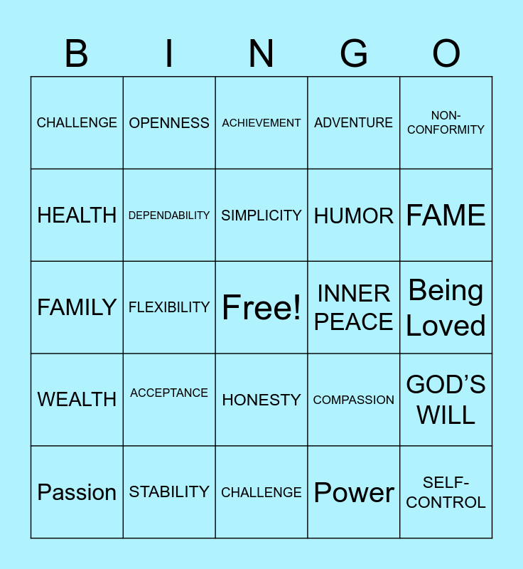 This bingo card has a free space and 24 words: ACCEPTANCE, STABILITY, SIMPLICITY, Passion, NON-CONFORMITY, CHALLENGE, HEALTH, OPENNESS, INNER PEACE, HONESTY, HUMOR, FAMILY, COMPASSION, GOD’S WILL, DEPENDABILITY, Power, Being Loved, ACHIEVEMENT, FAME, FLEXIBILITY, SELF-CONTROL, WEALTH, ADVENTURE and CHALLENGE.
