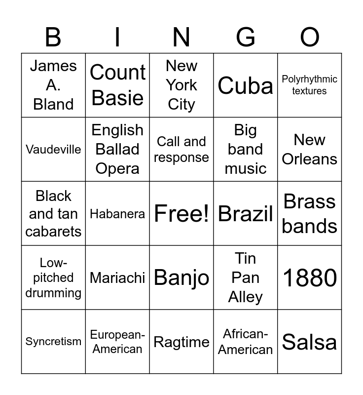 This bingo card has a free space and 39 words: Latin-American, Ballad, Louis Armstrong, English Ballad Opera, Syncretism, Banjo, Call and response, Riffs, Polyrhythmic textures, Low-pitched drumming, Habanera, Cuba, Salsa, Brass bands, Brazil, Mariachi, Minstrel Shows, James A. Bland, John Phillip Sousa, Tin Pan Alley, Vaudeville, Ragtime, Big band music, New Orleans, Jazz, Flappers, Paul Whiteman, Swing, Benny Goodman, Count Basie, Duke Ellington, Glen Miller, New York City, European-American, African-American, 1900, 1880, Black and tan cabarets and 70 years.
