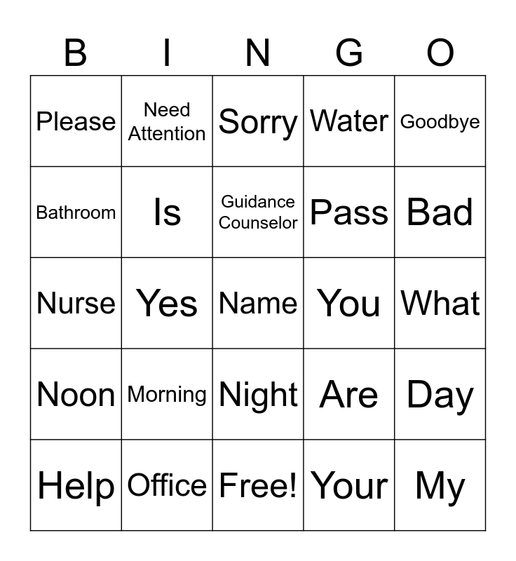 This bingo card has 31 words: Free!, Thank You / You're Welcome, Yes, No, Please, Sorry, Is, Are, You, Your, What, Name, My, Good, Bad, So-So (Okay/Maybe), Day, Morning, Noon, Night, Goodbye, See You Later, Help, Need Attention, Pass, Bathroom, Water, Nurse, Office, Guidance Counselor and How.