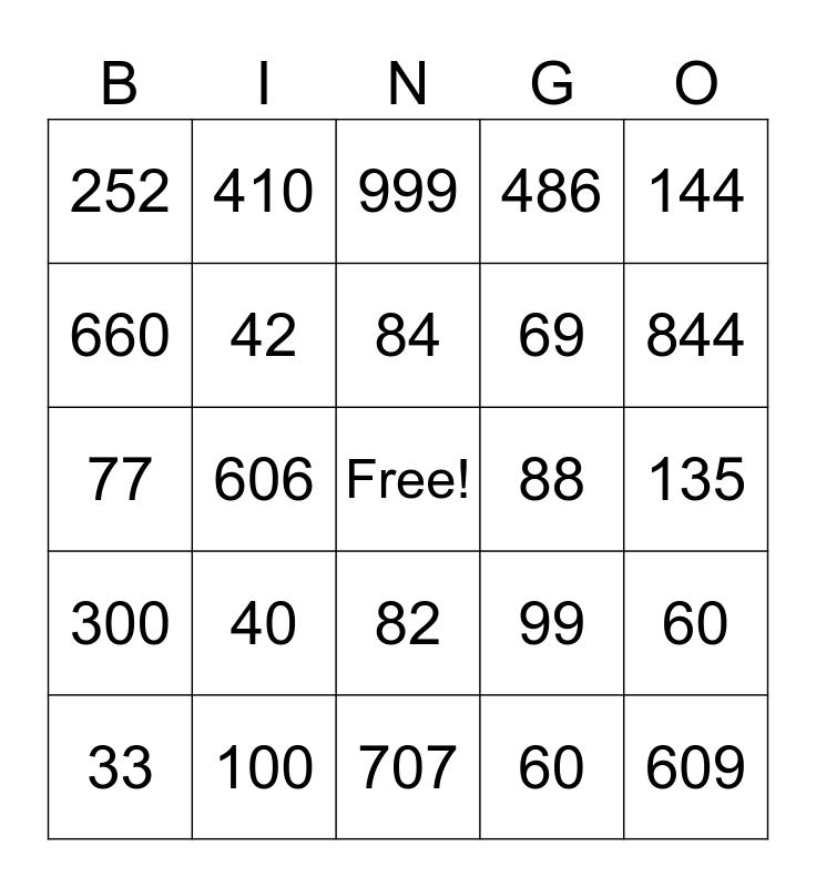 This bingo card has a free space and 24 words: 40, 100, 84, 33, 144, 252, 660, 410, 88, 82, 69, 77, 99, 60, 42, 60, 135, 999, 844, 606, 609, 300, 486 and 707.