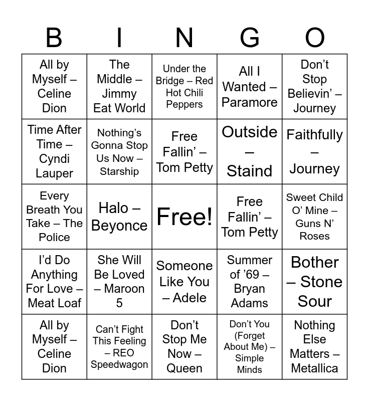 ⚠ This card has duplicate items: November Rain – Guns N RosesI Want to Know What Love is – Foreigner (2), With or Without You – U2 (2), (Everything I Do) I Do For You – Bryan Adams (2), Keep on Loving You – REO Speedwagon (2), Nothing Else Matters – Metallica (2), All by Myself – Celine Dion (2), Broken Wings – Mr. Mister (2), These Dreams – Heart (2), More Than Words – Extreme (2), Every Rose Has It’s Thorn – Poison (2), Open Arms – Journey (2), Black Velvet – Alannah Myles (2), Home Sweet Home – Motley Crue (2), Total Eclipse of the Heart – Bonnie Tyler (2), (I Just) Died In Your Arms – Cutting Crew (2), Never Tear Us Apart – INXS (2), If I Could Turn Back Time – Cher (2), Walking In Memphis – Marc Cohn (2), All Out of Love – Air Supply (2), Up Where We Belong – Joe Cocker & Jennifer Warnes (2), Incomplete – Backstreet Boys (2), Purple Rain – Prince (2), Poison – Alice Cooper (2), Love is a Battlefield – Pat Benetar (2), Right Here Waiting – Richard Marx (2), Nothing’s Gonna Stop Us Now – Starship (2), Under the Bridge – Red Hot Chili Peppers (2), Iris – The Goo Goo Dolls (2), Outside – Staind (2), Nothing Compares 2 U – Sinead O’Connor (2), Can’t Fight This Feeling – REO Speedwagon (2), If You’re Not the One – Daniel Bedingfield (2), Angel – Aerosmith (2), Bother – Stone Sour (2), Bring Me To Life – Evanescence (2), Dust In the Wind – Kansas (2), Hero – Enrique Iglesias (2), With Arms Wide Open – Creed (2), Faithfully – Journey (2), Don’t Stop Believin’ – Journey (2), I’d Do Anything For Love – Meat Loaf (2), Livin’ On A Prayer – Bon Jovi (2), Free Fallin’ – Tom Petty (2), I’ll Stand By You – Pretenders (2), Sweet Child O’ Mine – Guns N’ Roses (2), Time After Time – Cyndi Lauper (2), Girl On Fire – Alicia Keys (2), Don’t Stop Me Now – Queen (2), The Power of Love – Huey Lewis & The News (2), How To Save A Life – The Fray (2), Every Breath You Take – The Police (2), Take On Me – a-ha (2), Summer of ’69 – Bryan Adams (2), Firework – Katy Perry (2), You Spin Me Round (Like A Record) – Dead or Alive (2), Listen To Your Heart – Roxette (2), She Will Be Loved – Maroon 5 (2), Friday I’m In Love – The Cure (2), All Of Me – John Legend (2), When I was Your Man – Bruno Mars (2), The Middle – Jimmy Eat World (2), You and I Both – Jason Mraz (2), Don’t You (Forget About Me) – Simple Minds (2), Just Give Me A Reason – P!nk, Feat. Neate Ruess (2), I’m Not The Only One – Sam Smith (2), Halo – Beyonce (2), Someone Like You – Adele (2), What’s Up – 4 Non Blondes (2), Crazy Little Thing Called Love – Queen (2), Perfect – Ed Sheeran (2), Total Eclipse of The Heart - Bonnie Tyler (2), You’re Still the One – Shania Twain (2), All I Wanted – Paramore (2), When I Look Into Your Eyes - Firehouse (2)