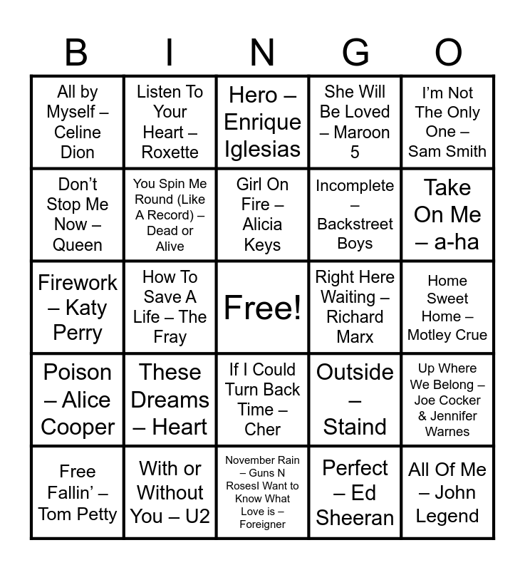 This bingo card has a free space and 74 words: Bring Me To Life – Evanescence, Dust In the Wind – Kansas, Hero – Enrique Iglesias, With Arms Wide Open – Creed, Faithfully – Journey, Don’t Stop Believin’ – Journey, I’d Do Anything For Love – Meat Loaf, Livin’ On A Prayer – Bon Jovi, Free Fallin’ – Tom Petty, I’ll Stand By You – Pretenders, Sweet Child O’ Mine – Guns N’ Roses, Time After Time – Cyndi Lauper, Girl On Fire – Alicia Keys, Don’t Stop Me Now – Queen, The Power of Love – Huey Lewis & The News, How To Save A Life – The Fray, Every Breath You Take – The Police, Take On Me – a-ha, Summer of ’69 – Bryan Adams, Firework – Katy Perry, You Spin Me Round (Like A Record) – Dead or Alive, Listen To Your Heart – Roxette, She Will Be Loved – Maroon 5, Friday I’m In Love – The Cure, All Of Me – John Legend, When I was Your Man – Bruno Mars, The Middle – Jimmy Eat World, You and I Both – Jason Mraz, Don’t You (Forget About Me) – Simple Minds, Just Give Me A Reason – P!nk, Feat. Neate Ruess, I’m Not The Only One – Sam Smith, Halo – Beyonce, Someone Like You – Adele, What’s Up – 4 Non Blondes, Crazy Little Thing Called Love – Queen, Perfect – Ed Sheeran, Total Eclipse of The Heart - Bonnie Tyler, You’re Still the One – Shania Twain, All I Wanted – Paramore, When I Look Into Your Eyes - Firehouse, November Rain – Guns N RosesI Want to Know What Love is – Foreigner, With or Without You – U2, (Everything I Do) I Do For You – Bryan Adams, Keep on Loving You – REO Speedwagon, Nothing Else Matters – Metallica, All by Myself – Celine Dion, Broken Wings – Mr. Mister, These Dreams – Heart, More Than Words – Extreme, Every Rose Has It’s Thorn – Poison, Open Arms – Journey, Black Velvet – Alannah Myles, Home Sweet Home – Motley Crue, Total Eclipse of the Heart – Bonnie Tyler, (I Just) Died In Your Arms – Cutting Crew, Never Tear Us Apart – INXS, If I Could Turn Back Time – Cher, Walking In Memphis – Marc Cohn, All Out of Love – Air Supply, Up Where We Belong – Joe Cocker & Jennifer Warnes, Incomplete – Backstreet Boys, Purple Rain – Prince, Poison – Alice Cooper, Love is a Battlefield – Pat Benetar, Right Here Waiting – Richard Marx, Nothing’s Gonna Stop Us Now – Starship, Under the Bridge – Red Hot Chili Peppers, Iris – The Goo Goo Dolls, Outside – Staind, Nothing Compares 2 U – Sinead O’Connor, Can’t Fight This Feeling – REO Speedwagon, If You’re Not the One – Daniel Bedingfield, Angel – Aerosmith and Bother – Stone Sour.