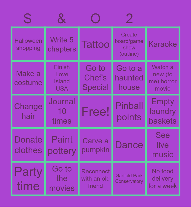 This bingo card has a free space and 24 words: Paint pottery, Go to the movies, Go to Chef's Special, Party time, Karaoke, Halloween shopping, Make a costume, Write 5 chapters, Pinball points, Carve a pumpkin, Go to a haunted house, Change hair, Dance, See live music, Finish Love Island USA, Garfield Park Conservatory, Empty laundry baskets, Tattoo, Watch a new (to me) horror movie, Journal 10 times, No food delivery for a week, Donate clothes, Create board/game show (outline) and Reconnect with an old friend.