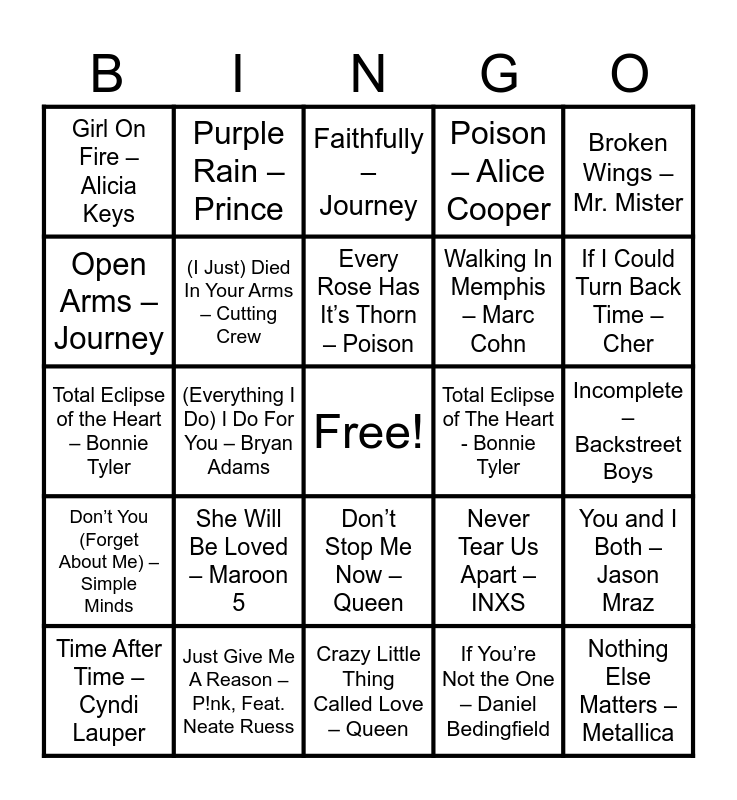 This bingo card has a free space and 75 words: Hero – Enrique Iglesias, With Arms Wide Open – Creed, Faithfully – Journey, Don’t Stop Believin’ – Journey, I’d Do Anything For Love – Meat Loaf, Livin’ On A Prayer – Bon Jovi, Free Fallin’ – Tom Petty, November Rain – Guns N Roses, I Want to Know What Love is – Foreigner, With or Without You – U2, These Dreams – Heart, More Than Words – Extreme, Every Rose Has It’s Thorn – Poison, Open Arms – Journey, Black Velvet – Alannah Myles, (Everything I Do) I Do For You – Bryan Adams, Keep on Loving You – REO Speedwagon, Nothing Else Matters – Metallica, All by Myself – Celine Dion, Broken Wings – Mr. Mister, Home Sweet Home – Motley Crue, Total Eclipse of the Heart – Bonnie Tyler, (I Just) Died In Your Arms – Cutting Crew, Purple Rain – Prince, Poison – Alice Cooper, Love is a Battlefield – Pat Benetar, Right Here Waiting – Richard Marx, Nothing’s Gonna Stop Us Now – Starship, Under the Bridge – Red Hot Chili Peppers, Iris – The Goo Goo Dolls, Outside – Staind, Nothing Compares 2 U – Sinead O’Connor, Can’t Fight This Feeling – REO Speedwagon, Never Tear Us Apart – INXS, If I Could Turn Back Time – Cher, Walking In Memphis – Marc Cohn, All Out of Love – Air Supply, Up Where We Belong – Joe Cocker & Jennifer Warnes, Incomplete – Backstreet Boys, If You’re Not the One – Daniel Bedingfield, Angel – Aerosmith, Bother – Stone Sour, Bring Me To Life – Evanescence, Dust In the Wind – Kansas, I’ll Stand By You – Pretenders, Sweet Child O’ Mine – Guns N’ Roses, Time After Time – Cyndi Lauper, Girl On Fire – Alicia Keys, I’m Not The Only One – Sam Smith, Halo – Beyonce, Someone Like You – Adele, Don’t Stop Me Now – Queen, The Power of Love – Huey Lewis & The News, How To Save A Life – The Fray, Every Breath You Take – The Police, Take On Me – a-ha, Summer of ’69 – Bryan Adams, Firework – Katy Perry, You Spin Me Round (Like A Record) – Dead or Alive, Listen To Your Heart – Roxette, She Will Be Loved – Maroon 5, Friday I’m In Love – The Cure, All Of Me – John Legend, When I was Your Man – Bruno Mars, The Middle – Jimmy Eat World, Total Eclipse of The Heart - Bonnie Tyler, You’re Still the One – Shania Twain, All I Wanted – Paramore, When I Look Into Your Eyes - Firehouse, You and I Both – Jason Mraz, Don’t You (Forget About Me) – Simple Minds, Just Give Me A Reason – P!nk, Feat. Neate Ruess, What’s Up – 4 Non Blondes, Crazy Little Thing Called Love – Queen and Perfect – Ed Sheeran.