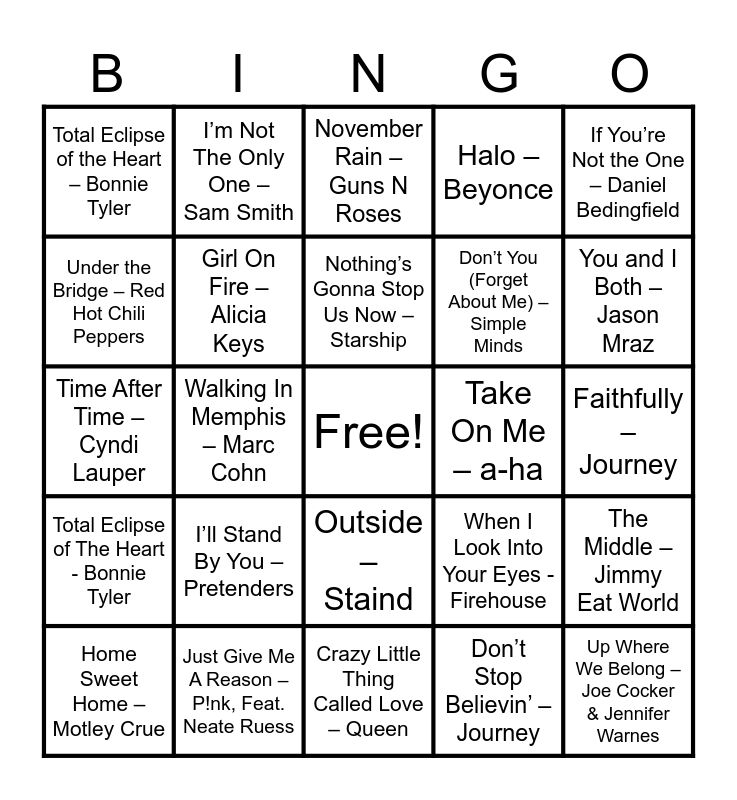 This bingo card has a free space and 75 words: Livin’ On A Prayer – Bon Jovi, Free Fallin’ – Tom Petty, November Rain – Guns N Roses, I Want to Know What Love is – Foreigner, With or Without You – U2, (Everything I Do) I Do For You – Bryan Adams, Keep on Loving You – REO Speedwagon, Nothing Else Matters – Metallica, All by Myself – Celine Dion, Broken Wings – Mr. Mister, Love is a Battlefield – Pat Benetar, Right Here Waiting – Richard Marx, Nothing’s Gonna Stop Us Now – Starship, Under the Bridge – Red Hot Chili Peppers, Iris – The Goo Goo Dolls, Walking In Memphis – Marc Cohn, All Out of Love – Air Supply, Up Where We Belong – Joe Cocker & Jennifer Warnes, Incomplete – Backstreet Boys, If You’re Not the One – Daniel Bedingfield, Sweet Child O’ Mine – Guns N’ Roses, Time After Time – Cyndi Lauper, Girl On Fire – Alicia Keys, I’m Not The Only One – Sam Smith, Halo – Beyonce, Someone Like You – Adele, Summer of ’69 – Bryan Adams, Firework – Katy Perry, You Spin Me Round (Like A Record) – Dead or Alive, Listen To Your Heart – Roxette, She Will Be Loved – Maroon 5, You’re Still the One – Shania Twain, All I Wanted – Paramore, When I Look Into Your Eyes - Firehouse, You and I Both – Jason Mraz, Don’t You (Forget About Me) – Simple Minds, Hero – Enrique Iglesias, With Arms Wide Open – Creed, Faithfully – Journey, Don’t Stop Believin’ – Journey, I’d Do Anything For Love – Meat Loaf, These Dreams – Heart, More Than Words – Extreme, Every Rose Has It’s Thorn – Poison, Open Arms – Journey, Black Velvet – Alannah Myles, Home Sweet Home – Motley Crue, Total Eclipse of the Heart – Bonnie Tyler, (I Just) Died In Your Arms – Cutting Crew, Purple Rain – Prince, Poison – Alice Cooper, Outside – Staind, Nothing Compares 2 U – Sinead O’Connor, Can’t Fight This Feeling – REO Speedwagon, Never Tear Us Apart – INXS, If I Could Turn Back Time – Cher, Angel – Aerosmith, Bother – Stone Sour, Bring Me To Life – Evanescence, Dust In the Wind – Kansas, I’ll Stand By You – Pretenders, Don’t Stop Me Now – Queen, The Power of Love – Huey Lewis & The News, How To Save A Life – The Fray, Every Breath You Take – The Police, Take On Me – a-ha, Friday I’m In Love – The Cure, All Of Me – John Legend, When I was Your Man – Bruno Mars, The Middle – Jimmy Eat World, Total Eclipse of The Heart - Bonnie Tyler, Just Give Me A Reason – P!nk, Feat. Neate Ruess, What’s Up – 4 Non Blondes, Crazy Little Thing Called Love – Queen and Perfect – Ed Sheeran.