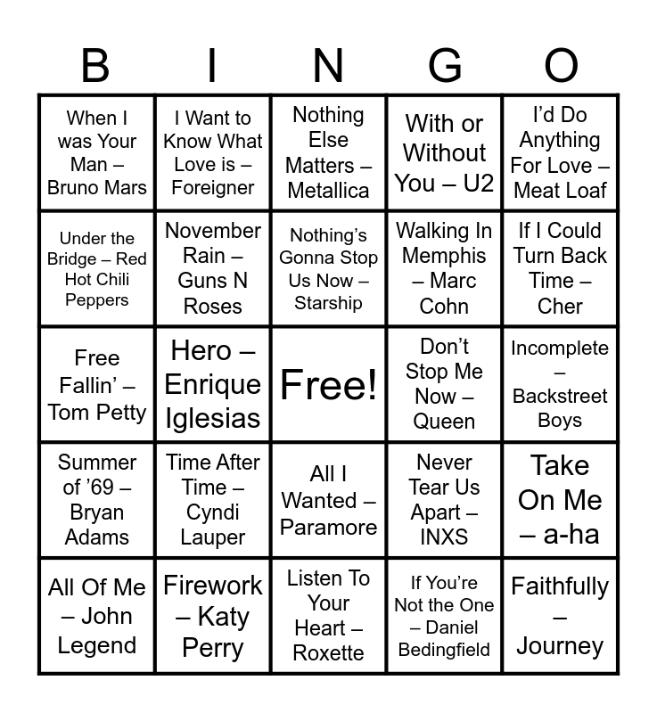 This bingo card has a free space and 75 words: (Everything I Do) I Do For You – Bryan Adams, Keep on Loving You – REO Speedwagon, Nothing Else Matters – Metallica, All by Myself – Celine Dion, Broken Wings – Mr. Mister, Home Sweet Home – Motley Crue, Total Eclipse of the Heart – Bonnie Tyler, (I Just) Died In Your Arms – Cutting Crew, Purple Rain – Prince, Poison – Alice Cooper, Love is a Battlefield – Pat Benetar, Right Here Waiting – Richard Marx, Nothing’s Gonna Stop Us Now – Starship, Under the Bridge – Red Hot Chili Peppers, Iris – The Goo Goo Dolls, Hero – Enrique Iglesias, With Arms Wide Open – Creed, Faithfully – Journey, Don’t Stop Believin’ – Journey, I’d Do Anything For Love – Meat Loaf, Livin’ On A Prayer – Bon Jovi, Free Fallin’ – Tom Petty, November Rain – Guns N Roses, I Want to Know What Love is – Foreigner, With or Without You – U2, These Dreams – Heart, More Than Words – Extreme, Every Rose Has It’s Thorn – Poison, Open Arms – Journey, Black Velvet – Alannah Myles, Outside – Staind, Nothing Compares 2 U – Sinead O’Connor, Can’t Fight This Feeling – REO Speedwagon, Never Tear Us Apart – INXS, If I Could Turn Back Time – Cher, Walking In Memphis – Marc Cohn, All Out of Love – Air Supply, Up Where We Belong – Joe Cocker & Jennifer Warnes, Incomplete – Backstreet Boys, If You’re Not the One – Daniel Bedingfield, Angel – Aerosmith, Bother – Stone Sour, Bring Me To Life – Evanescence, Dust In the Wind – Kansas, I’ll Stand By You – Pretenders, Friday I’m In Love – The Cure, All Of Me – John Legend, When I was Your Man – Bruno Mars, The Middle – Jimmy Eat World, Total Eclipse of The Heart - Bonnie Tyler, You’re Still the One – Shania Twain, All I Wanted – Paramore, When I Look Into Your Eyes - Firehouse, You and I Both – Jason Mraz, Don’t You (Forget About Me) – Simple Minds, Just Give Me A Reason – P!nk, Feat. Neate Ruess, What’s Up – 4 Non Blondes, Crazy Little Thing Called Love – Queen, Perfect – Ed Sheeran, Sweet Child O’ Mine – Guns N’ Roses, Time After Time – Cyndi Lauper, Girl On Fire – Alicia Keys, I’m Not The Only One – Sam Smith, Halo – Beyonce, Someone Like You – Adele, Don’t Stop Me Now – Queen, The Power of Love – Huey Lewis & The News, How To Save A Life – The Fray, Every Breath You Take – The Police, Take On Me – a-ha, Summer of ’69 – Bryan Adams, Firework – Katy Perry, You Spin Me Round (Like A Record) – Dead or Alive, Listen To Your Heart – Roxette and She Will Be Loved – Maroon 5.