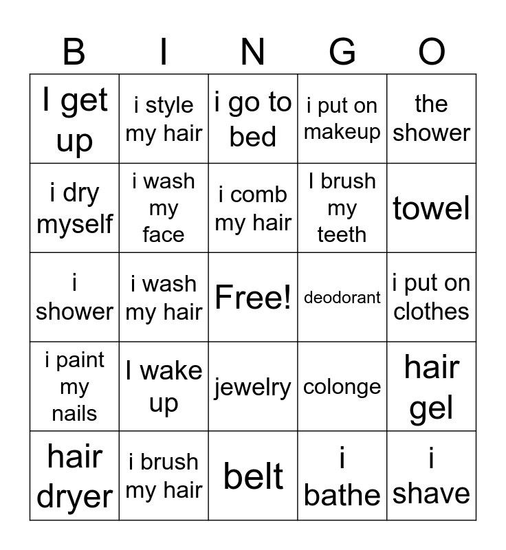 This bingo card has a free space and 24 words: I wake up, i brush my hair, i comb my hair, hair dryer, the shower, I get up, i dry myself, i style my hair, deodorant, jewelry, I brush my teeth, i shower, colonge, hair gel, i wash my face, i bathe, i put on clothes, i go to bed, towel, i wash my hair, i shave, i paint my nails, i put on makeup and belt.
