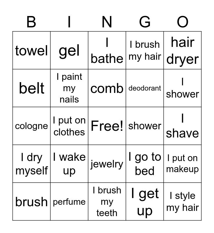 This bingo card has a free space and 24 words: I wake up, perfume, comb, brush, hair dryer, towel, belt, gel, shower, jewelry, deodorant, cologne, I go to bed, I put on makeup, I paint my nails, I get up, I shave, I bathe, I shower, I put on clothes, I style my hair, I dry myself, I brush my hair and I brush my teeth.