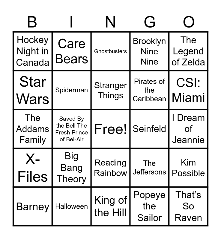 This bingo card has a free space and 39 words: Pokémon, Gilligan’s Island, Nightmare Before Christmas, Spiderman, Barney, Reading Rainbow, Stranger Things, Hannah Montana, The Legend of Zelda, X-Files, Saved By the Bell The Fresh Prince of Bel-Air, Brooklyn Nine Nine, That’s So Raven, I Dream of Jeannie, Seinfeld, Big Bang Theory, The Smurfs, Hockey Night in Canada, Simpsons, The Jeffersons, Star Wars, King of the Hill, Pirates of the Caribbean, CSI: Miami, Looney Tunes, Brady Bunch, The Fairly Odd Parents, Harry Potter, The Flintstones, Care Bears, Lord of the Rings, Malcolm in the Middle, Ghostbusters, Halloween, Popeye the Sailor, The Lion King, Kim Possible, The Addams Family and Scooby-Doo.