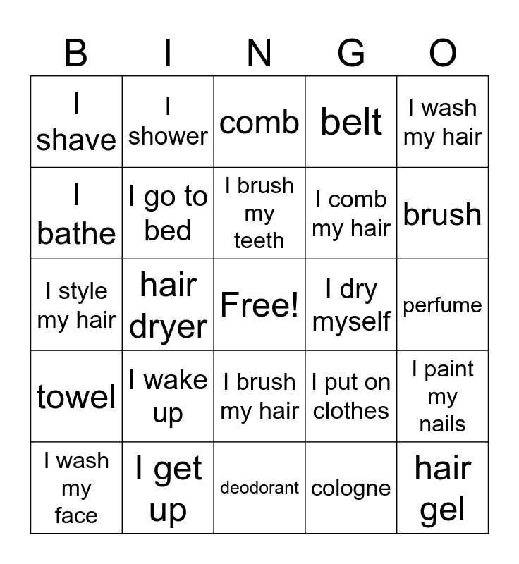 This bingo card has a free space and 24 words: I wake up, I get up, I brush my teeth, I wash my face, I wash my hair, I shave, I bathe, I shower, I dry myself, I brush my hair, I comb my hair, I style my hair, I put on clothes, I paint my nails, I go to bed, cologne, perfume, comb, brush, hair dryer, hair gel, towel, belt and deodorant.