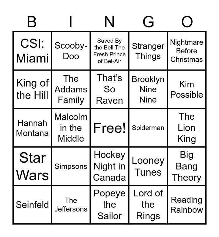This bingo card has a free space and 39 words: The Flintstones, Barney, Harry Potter, The Addams Family, Seinfeld, Hockey Night in Canada, That’s So Raven, Care Bears, Nightmare Before Christmas, Star Wars, Malcolm in the Middle, Stranger Things, Reading Rainbow, The Lion King, Spiderman, Simpsons, The Smurfs, CSI: Miami, The Fairly Odd Parents, Looney Tunes, King of the Hill, Popeye the Sailor, Brooklyn Nine Nine, Kim Possible, X-Files, Halloween, I Dream of Jeannie, Pirates of the Caribbean, Pokémon, Scooby-Doo, Brady Bunch, Gilligan’s Island, Saved By the Bell The Fresh Prince of Bel-Air, The Jeffersons, Lord of the Rings, The Legend of Zelda, Big Bang Theory, Hannah Montana and Ghostbusters.