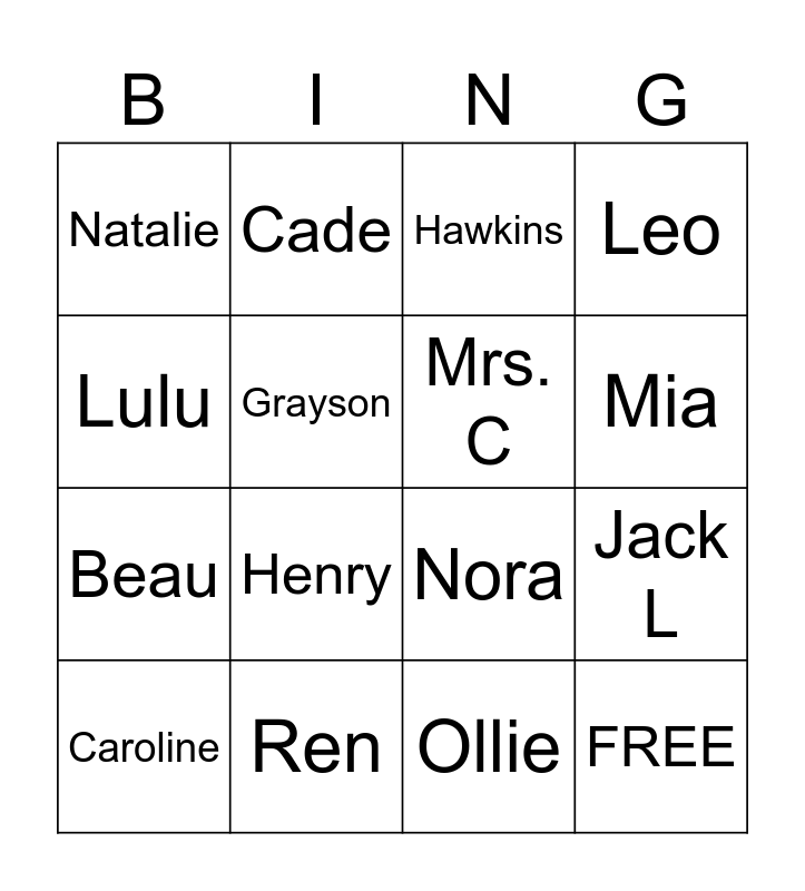 This bingo card has 16 words: Ren, Jack L, Hawkins, Natalie, Beau, Cade, Nora, Ollie, Lulu, Grayson, Caroline, Leo, Henry, Mia, Mrs. C and FREE.