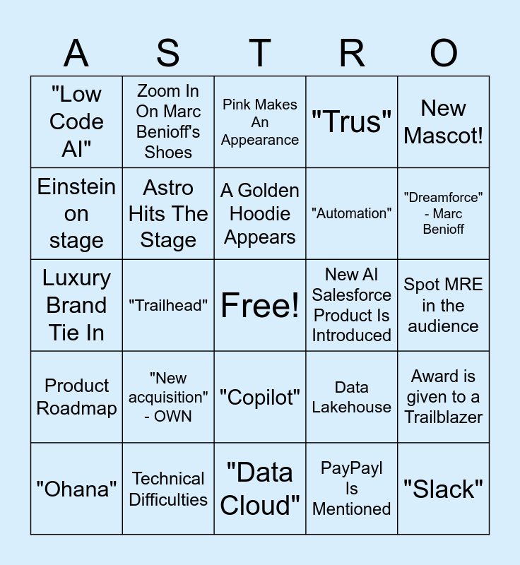 This bingo card has a free space and 32 words: PayPayl Is Mentioned, "Digital Transformation", "Trailhead", New Cert Announced, Product Roadmap, Astro Hits The Stage, New Mascot!, Award is given to a Trailblazer, Zoom In On Marc Benioff's Shoes, Surprise Music Act, A Golden Hoodie Appears, Pink Makes An Appearance, Matthew McConaughey Makes An Appearance, Salesforce Presenters Dance, New AI Salesforce Product Is Introduced, "Agentforce", "Ohana", Luxury Brand Tie In, "Copilot", "New acquisition" - OWN, Data Lakehouse, "Sustainability", Spot MRE in the audience, Technical Difficulties, "Slack", "Trus", "Automation", Einstein on stage, "Low Code AI", "Data Cloud", "Salesforce" - Marc Benioff and "Dreamforce" - Marc Benioff.