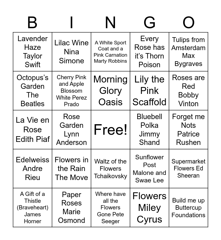 This bingo card has a free space and 24 words: Flowers in the Rain The Move, Paper Roses Marie Osmond, Morning Glory Oasis, A Gift of a Thistle (Braveheart) James Horner, Tulips from Amsterdam Max Bygraves, Lavender Haze Taylor Swift, Octopus’s Garden The Beatles, Lilac Wine Nina Simone, Bluebell Polka Jimmy Shand, Waltz of the Flowers Tchaikovsky, Lily the Pink Scaffold, La Vie en Rose Edith Piaf, Sunflower Post Malone and Swae Lee, Supermarket Flowers Ed Sheeran, Cherry Pink and Apple Blossom White Perez Prado, Flowers Miley Cyrus, Forget me Nots Patrice Rushen, A White Sport Coat and a Pink Carnation Marty Robbins, Roses are Red Bobby Vinton, Rose Garden Lynn Anderson, Build me up Buttercup Foundations, Edelweiss Andre Rieu, Every Rose has it’s Thorn Poison and Where have all the Flowers Gone Pete Seeger.