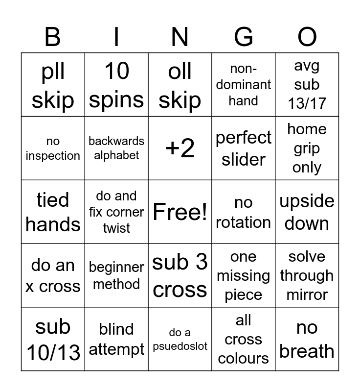 This bingo card has a free space and 24 words: beginner method, blind attempt, +2, sub 10/13, avg sub 13/17, pll skip, no inspection, 10 spins, no rotation, sub 3 cross, perfect slider, tied hands, one missing piece, solve through mirror, backwards alphabet, all cross colours, upside down, oll skip, home grip only, do and fix corner twist, no breath, do an x cross, non-dominant hand and do a psuedoslot.