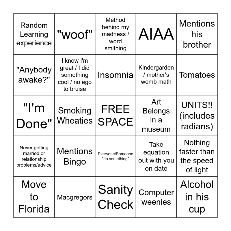 This bingo card has a free space and 41 words: Mentions Buffalo, "I'm Done", Flock of Seagulls, I know I'm great / I did something cool / no ego to bruise, Macgregors, Everyone/Someone "do something", Insomnia, Mentions Calspan/Vista, Mentions his brother, Never getting married or relationship problems/advice, Smoking Wheaties, AIAA, Alcohol in his cup, UNITS!! (includes radians), Art Belongs in a museum, Mentions Bingo, Flat earthers / make 50 grand from idiots, Random Learning experience, Crazy backstory, Method behind my madness / word smithing, Nothing faster than the speed of light, "We good?", Sanity Check, Kindergarden / mother's womb math, First class ever / no one is going to..., Anyone think this is cool?, Computer weenies, Having fun?, Tomatoes, Absolute genius, Dont do anything stupid / I did something stupid, "woof", Move to Florida, I'm here to help you, Take equation out with you on date, "Anybody awake?", Let the math do the work for you, "Physicality", Greek vs English, Speeding and Wine tasting.