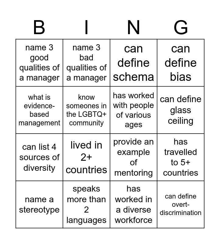 This bingo card has 16 words: speaks more than 2 languages, has travelled to 5+ countries, can define schema, name 3 good qualities of a manager, can list 4 sources of diversity, name 3 bad qualities of a manager, provide an example of mentoring, has worked in a diverse workforce, what is evidence-based management, know someones in the LGBTQ+ community, name a stereotype, can define bias, lived in 2+ countries, can define glass ceiling, has worked with people of various ages and can define overt-discrimination.