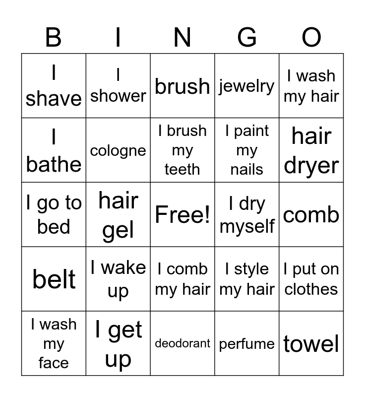 This bingo card has a free space and 24 words: I wake up, I get up, I brush my teeth, I wash my face, I wash my hair, I shave, I bathe, I shower, I dry myself, I comb my hair, I paint my nails, I go to bed, I style my hair, I put on clothes, cologne, perfume, comb, brush, hair dryer, hair gel, towel, belt, jewelry and deodorant.