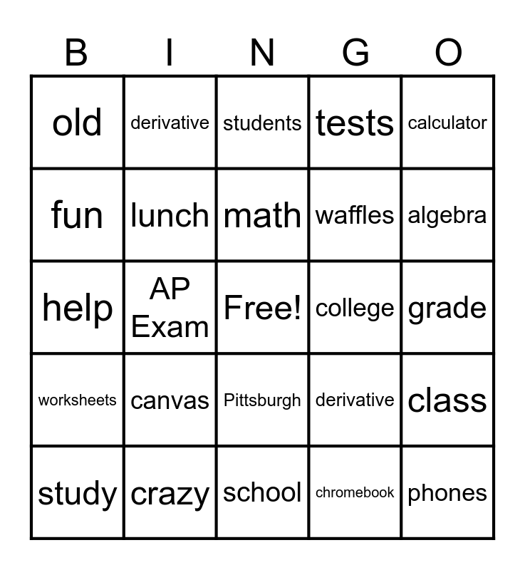 This bingo card has a free space and 24 words: canvas, crazy, math, study, calculator, old, fun, derivative, college, Pittsburgh, waffles, help, derivative, class, lunch, chromebook, grade, students, algebra, AP Exam, phones, worksheets, tests and school.