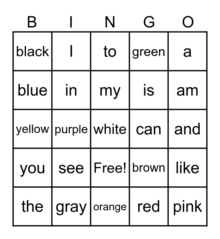 This bingo card has 26 words: Free!, red, my, gray, a, black, blue, I, and, brown, is, yellow, like, the, purple, go, green, you, to, white, am, orange, can, see, in and pink.