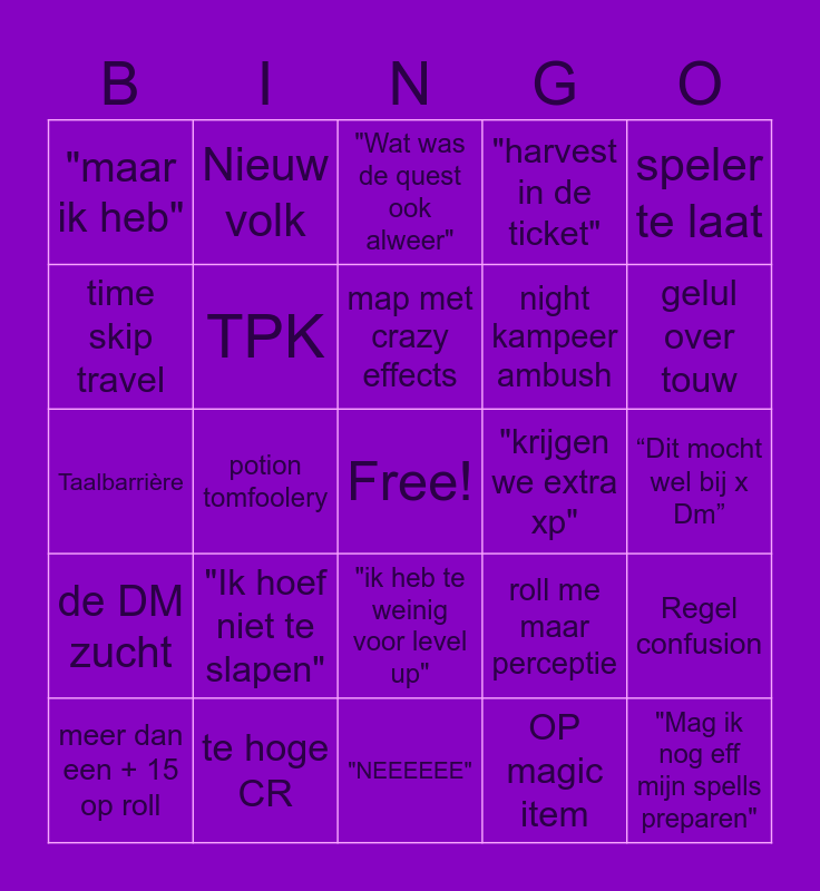This bingo card has a free space and 43 words: Dungeon crawling, "Mag ik nog eff mijn spells preparen", "Mag ik nog craften/potion", meer dan een + 15 op roll, meer dan 50 dmg op 1 turn, OP magic item, "Wat was de quest ook alweer", Dm kent lore niet, speler te laat, te hoge CR, "harvest in de ticket", "krijgen we extra xp", "ik heb te weinig voor level up", "Ik hoef niet te slapen", Dm kent je backstory niet, "NEEEEEE", "Dat is 10 gold voor armoury", Taalbarrière, "weet je het zeker", gelul over touw, Nieuw volk, Nieuwe creature, "Ik ga een rp ticket maken", "maar ik heb", "Er is geen spectate token", “Dit mocht wel bij x Dm”, watch order, spyglass momentje, roll me maar perceptie, de DM zucht, de DM neemt pauze, Regel confusion, Save or Die, potion tomfoolery, artifice(r) mentioned, meer dan 5 nat 20’s, jeroentje, map met crazy effects, time skip travel, night kampeer ambush, Quest start muziek, TPK and Fallou cope.