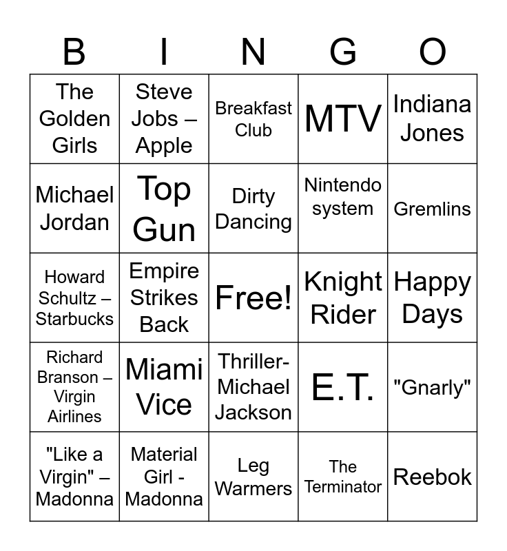 This bingo card has a free space and 34 words: Back to the Future, The Terminator, Purple Rain – Prince, Girls Just want to have fun- Cindy Lauper, Richard Branson – Virgin Airlines, Top Gun, Indiana Jones, "Like a Virgin" – Madonna, Steve Jobs – Apple, Bill Gates – Microsoft, Dirty Dancing, Breakfast Club, Oprah Winfrey – Harpo Productions, Michael Dell – Dell Technologies, Knight Rider, Gremlins, Material Girl -Madonna, Howard Schultz – Starbucks, Miami Vice, E.T., Thriller- Michael Jackson, We Are the World" – USA for Africa, The Golden Girls, Happy Days, Leg Warmers, Reebok, MTV, Pac-Man, Nintendo system, Michael Jordan, Back to the Future, Empire Strikes Back, "Gnarly" and Bogus.