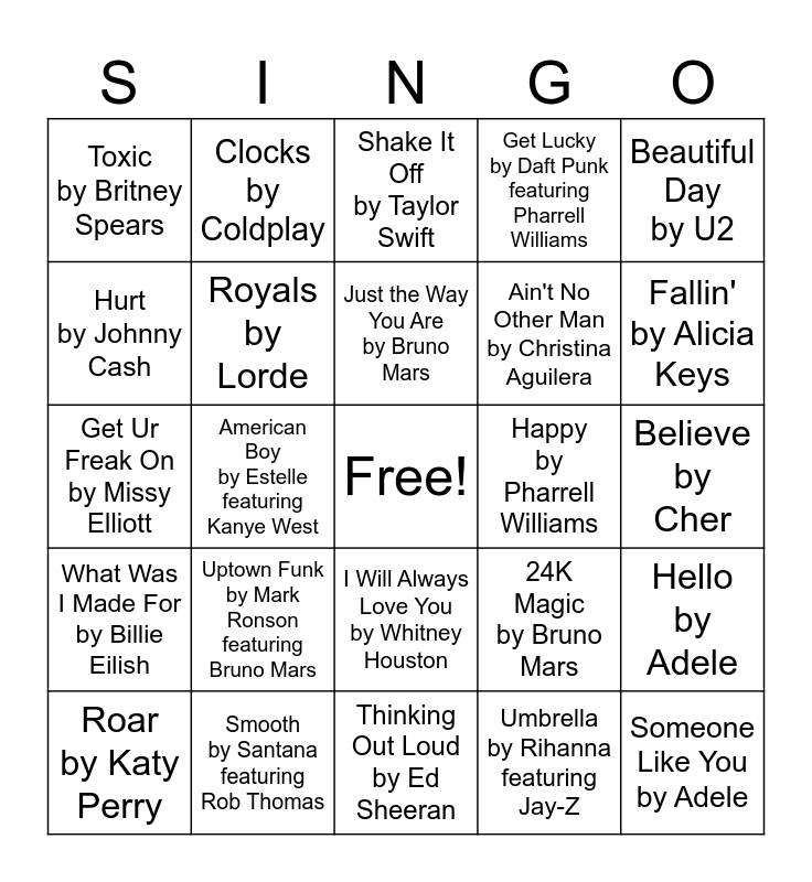 This bingo card has a free space and 50 words: Rolling in the Deep by Adele, Someone Like You by Adele, Stay with Me by Sam Smith, Thinking Out Loud by Ed Sheeran, Uptown Funk by Mark Ronson featuring Bruno Mars, Rehab by Amy Winehouse, Clocks by Coldplay, Boulevard of Broken Dreams by Green Day, Hurt by Johnny Cash, Don't Know Why by Norah Jones, Royals by Lorde, Get Lucky by Daft Punk featuring Pharrell Williams, Hello by Adele, 24K Magic by Bruno Mars, Bad Guy by Billie Eilish, Formation by Beyoncé, Just the Way You Are by Bruno Mars, Happy by Pharrell Williams, Daughters by John Mayer, Beautiful Day by U2, American Boy by Estelle featuring Kanye West, Umbrella by Rihanna featuring Jay-Z, Toxic by Britney Spears, Ain't No Other Man by Christina Aguilera, My Heart Will Go On by Celine Dion, Smells Like Teen Spirit by Nirvana, Fallin' by Alicia Keys, Viva La Vida by Coldplay, Shake It Off by Taylor Swift, I Will Always Love You by Whitney Houston, Back to Black by Amy Winehouse, I Gotta Feeling by The Black Eyed Peas, Hey Ya! by OutKast, Tears in Heaven by Eric Clapton, Smooth by Santana featuring Rob Thomas, Waterfalls by TLC, No Scrubs by TLC, Bodak Yellow by Cardi B, Kiss from a Rose by Seal, Believe by Cher, Like a Prayer by Madonna, Run This Town by Jay-Z, Rihanna, and Kanye West, If I Ain't Got You by Alicia Keys, Tennessee Whiskey by Chris Stapleton, Roar by Katy Perry, Get Ur Freak On by Missy Elliott, All of Me by John Legend, Single Ladies by Beyonce, What Was I Made For by Billie Eilish and Vampire by Olivia Rodrigo.