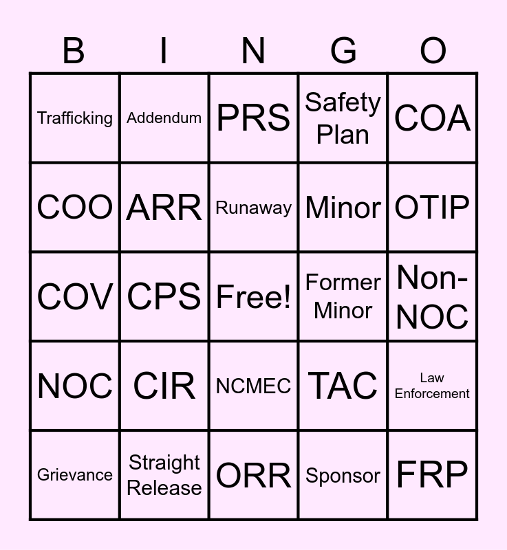 This bingo card has a free space and 24 words: CIR, Straight Release, Runaway, Grievance, COA, Trafficking, COO, Addendum, Former Minor, NCMEC, Minor, COV, TAC, Law Enforcement, ARR, Sponsor, Non-NOC, PRS, OTIP, CPS, FRP, NOC, Safety Plan and ORR.