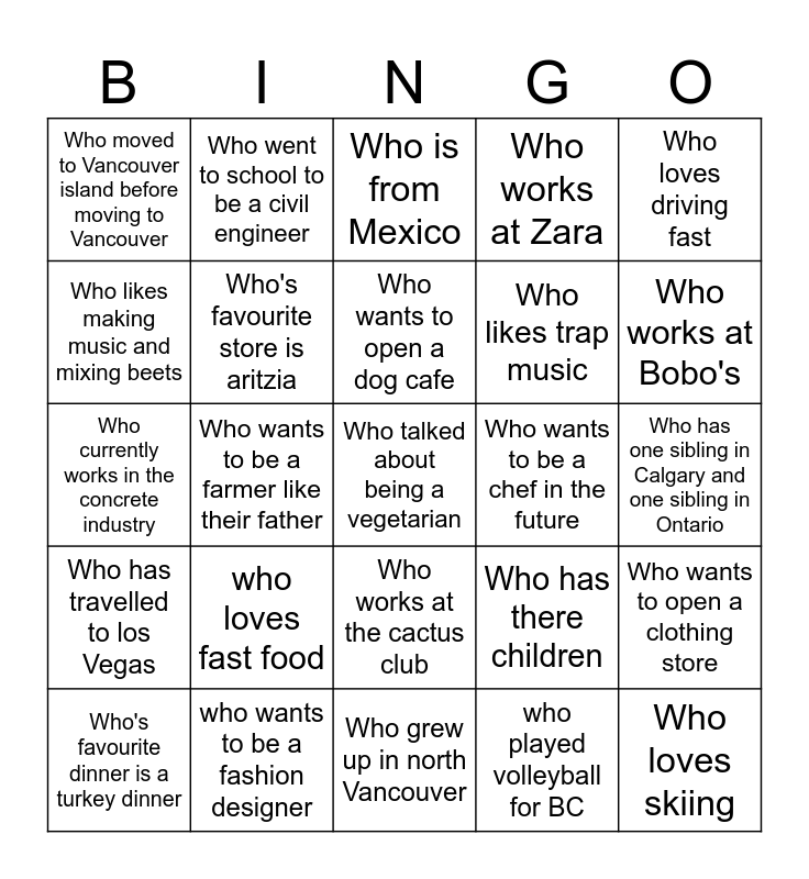 This bingo card has a free space and 24 words: who loves fast food, who wants to be a fashion designer, Who wants to open a dog cafe, Who's favourite dinner is a turkey dinner, Who loves driving fast, Who moved to Vancouver island before moving to Vancouver, Who likes making music and mixing beets, Who went to school to be a civil engineer, Who wants to be a chef in the future, Who works at the cactus club, Who likes trap music, Who currently works in the concrete industry, Who has there children, Who wants to open a clothing store, Who's favourite store is aritzia, who played volleyball for BC, Who has one sibling in Calgary and one sibling in Ontario, Who is from Mexico, Who works at Bobo's, Who wants to be a farmer like their father, Who loves skiing, Who has travelled to los Vegas, Who works at Zara and Who grew up in north Vancouver.