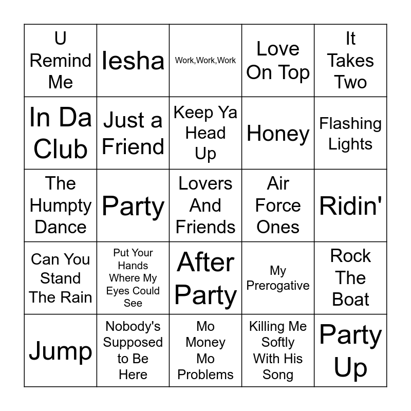 This bingo card has 80 words: Beat It, You Remind Me, Work,Work,Work, Dance With Me, Peaches & Cream, Back & Forth, My Boo, Hey Mr. D.J., Where the Party At, You, Tell Me, Lady, Love On Top, U Remind Me, The Way You Move, In Da Club, Still Not a Player, Put Your Hands Where My Eyes Could See, Good Life, Ridin', My Adidas, It Takes Two, The Humpty Dance, Keep Ya Head Up, Just a Friend, The Choice Is Yours, I Wish, No Guidance, In My Feelings, It's Goin' Down, Flashing Lights, 2 Legit 2 Quit, Mo Money Mo Problems, Party Up, Jump, Air Force Ones, Summertime, Finesse, Uptown Funk, Lovers And Friends, Dilemma, I Like The Way, Feels Good, Nuttin' But Love, Dial My Heart, Iesha, I Need Love, My Love, Don't Talk, Where My Girls At, Rock The Boat, Party, My Prerogative, Motownphilly, U Know, Tyrone, When I See U, Just In Case, Come & Talk To Me, After Party, Honey, P.Y.T., So Gone, Mr. Telephone Man, Wifey, I Love Your Smile, Weak, Just Kickin' It, One, Two Step, Beautiful, Can You Stand The Rain, Nobody's Supposed to Be Here, I'm Dreamin', Confessions Part II, Doo Wop, Ms. Jackson, Killing Me Softly With His Song, Here Comes the Hotstepper, Try Again and Let's Get Married.
