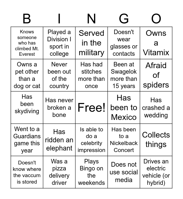 This bingo card has a free space and 24 words: Doesn't know where the vaccum is stored, Has ridden an elephant, Has had stitches more than once, Does not use social media, Owns a Vitamix, Knows someone who has climbed Mt. Everest, Played a Division I sport in college, Served in the military, Has been to Mexico, Has crashed a wedding, Has been skydiving, Never been out of the country, Has been to a Nickelback Concert, Collects things, Owns a pet other than a dog or cat, Was a pizza delivery driver, Plays Bingo on the weekends, Doesn't wear glasses or contacts, Afraid of spiders, Went to a Guardians game this year, Has never broken a bone, Is able to do a celebrity impression, Been at Swagelok more than 15 years and Drives an electric vehicle (or hybrid).