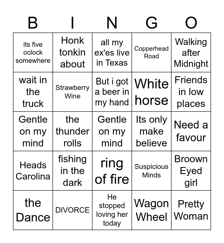 This bingo card has a free space and 64 words: something in the orange, boot Scootin boogie, Sweet Caroline, Broown Eyed girl, I had some help, Watermelon Moonshine, Honk tonkin about, Last night, But i got a beer in my hand, Heart like a truck, ring of fire, Kiss an angel good morning, Need a favour, Walking after Midnight, Save me, wait in the truck, the thunder rolls, its five oclock somewhere, Shallow, White horse, fishing in the dark, Heads Carolina, Copperhead Road, Friends in low places, rock and a hard place, bury me in Georgia, buy dirt, wild and free, Stand by your man, please help me im falling, king of the road, A bar song, hey mom i made it, Like i love country, Friends in low places, the Dance, chicken Fried, Wagon Wheel, Tennessee Whiskey, Strawberry Wine, Gentle on my mind, Its only make believe, Coal Miners Daughtter, The Lady in Red, Ring of Fire, Pretty Woman, DIVORCE, Walking after Midnight, Suspicious Minds, whiskey glasses, Crying for me, Still Woman enough, He stopped loving her today, Hold my beer, Its 5 oclock somewhere, Ten rounds with Jose Cuervo, all my ex'es live in Texas, margaritville, elvira, fishing in the Dark, nine to five, forever and ever amen, If You're gonna play in Texas and always on my Mind.