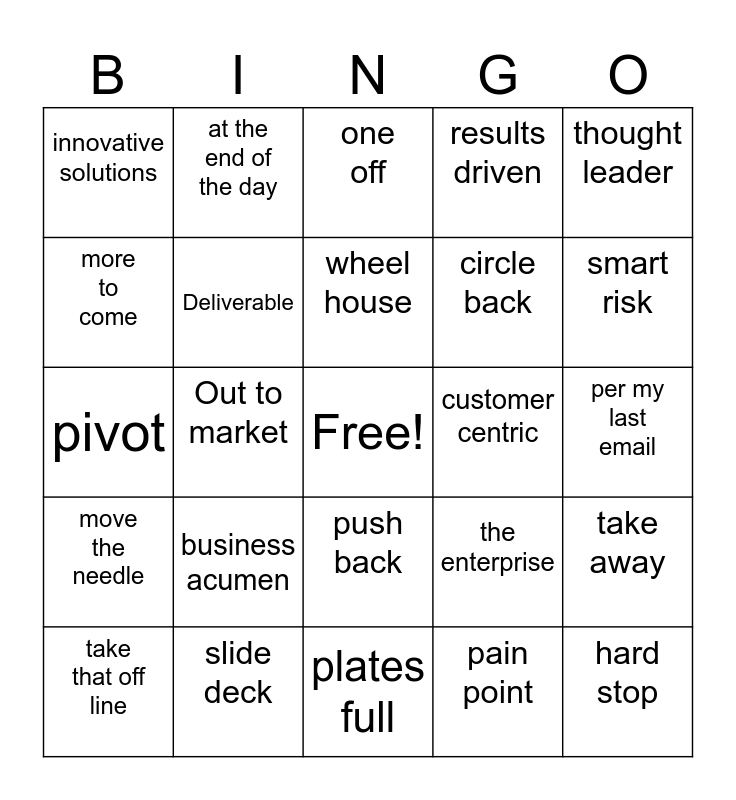 This bingo card has a free space and 24 words: business acumen, slide deck, wheel house, take that off line, thought leader, innovative solutions, more to come, at the end of the day, customer centric, push back, circle back, pivot, the enterprise, take away, Deliverable, pain point, per my last email, one off, smart risk, Out to market, hard stop, move the needle, results driven and plates full.