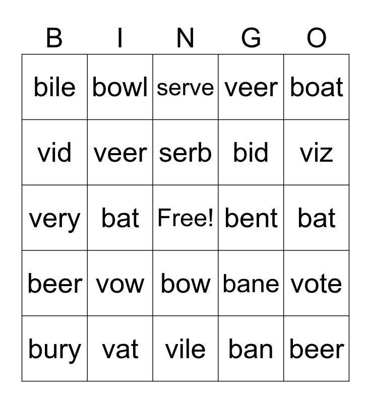 This bingo card has a free space and 32 words: ban, van, bat, vat, beer, veer, boat, vote, bowl, vole, serb, serve, bale, veil, bent, vent, bury, very, bow, vow, bane, vein, bat, vat, beer, veer, bid, vid, bile, vile, biz and viz.