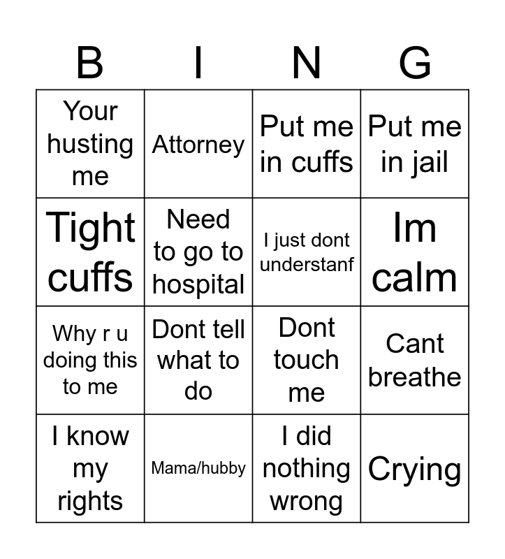 This bingo card has 16 words: Mama/hubby, Cant breathe, Put me in cuffs, Your husting me, Why r u doing this to me, Attorney, Dont touch me, I did nothing wrong, Tight cuffs, Need to go to hospital, I know my rights, Put me in jail, Dont tell what to do, Im calm, I just dont understanf and Crying.