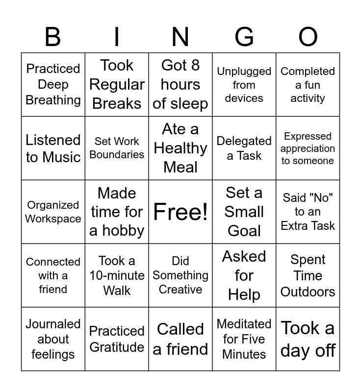 This bingo card has a free space and 24 words: Took a 10-minute Walk, Practiced Gratitude, Ate a Healthy Meal, Journaled about feelings, Completed a fun activity, Practiced Deep Breathing, Listened to Music, Took Regular Breaks, Set a Small Goal, Did Something Creative, Delegated a Task, Organized Workspace, Asked for Help, Spent Time Outdoors, Set Work Boundaries, Meditated for Five Minutes, Said "No" to an Extra Task, Got 8 hours of sleep, Expressed appreciation to someone, Made time for a hobby, Took a day off, Connected with a friend, Unplugged from devices and Called a friend.
