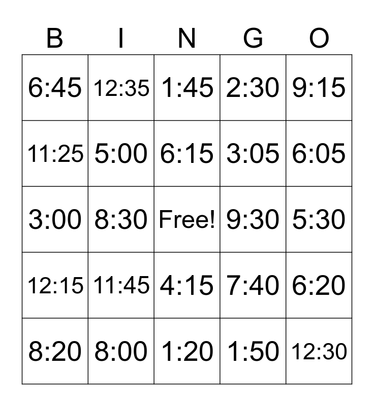 This bingo card has 40 words: 2:00, 3:00, 10:00, 5:00, 8:00, 4:15, 6:15, 1:15, 9:15, 12:15, 8:30, 2:30, Free!, 5:30, 9:30, 11:45, 3:45, 6:45, 9:45, 1:45, 6:20, 1:50, 3:05, 11:25, 10:35, 12:00, 7:15, 10:30, 12:30, 5:45, 10:10, 8:20, 2:55, 7:40, 6:05, 1:20, 8:50, 7:05, 12:35 and 5:25.