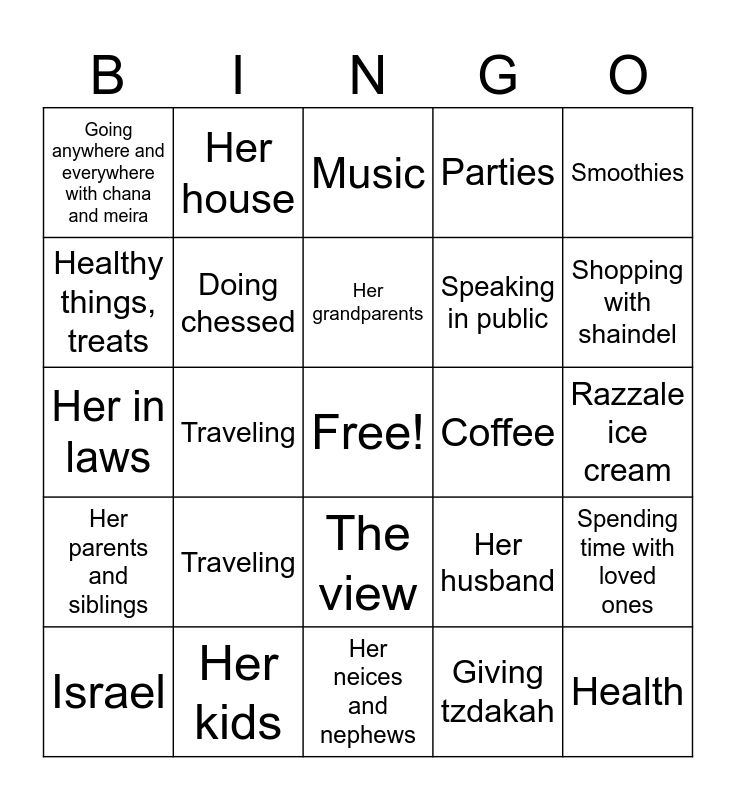 This bingo card has a free space and 24 words: Traveling, Her kids, Her grandparents, Israel, Smoothies, Going anywhere and everywhere with chana and meira, Healthy things, treats, Her house, Coffee, The view, Speaking in public, Her in laws, Her husband, Spending time with loved ones, Doing chessed, Giving tzdakah, Razzale ice cream, Music, Shopping with shaindel, Traveling, Health, Her parents and siblings, Parties and Her neices and nephews.