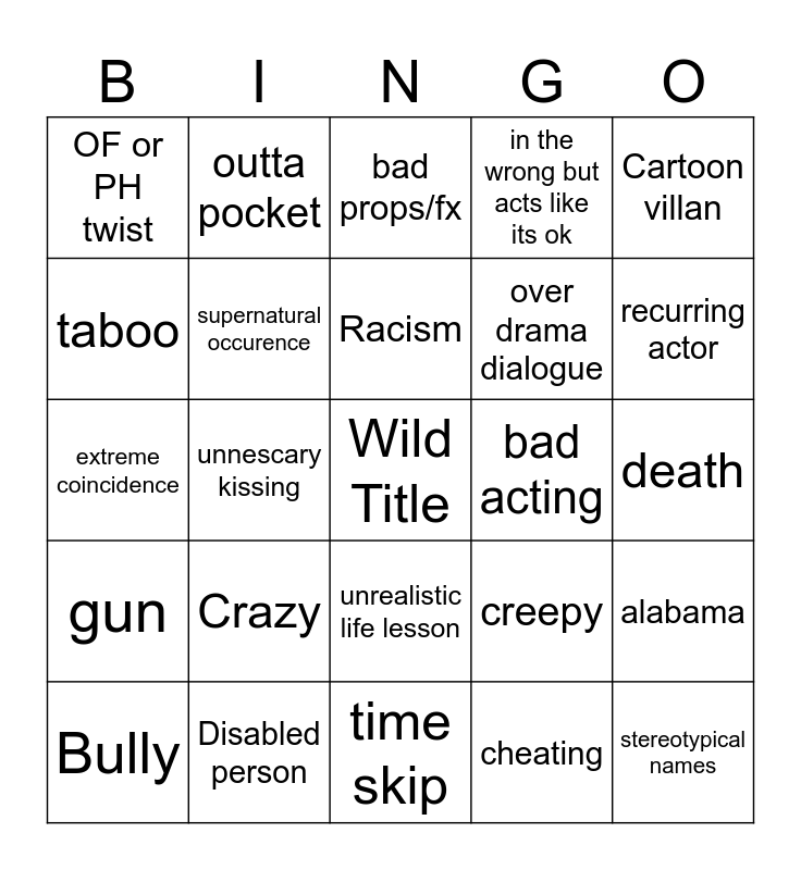 This bingo card has a free space and 24 words: Crazy, Disabled person, Racism, Bully, Cartoon villan, OF or PH twist, taboo, outta pocket, bad acting, unrealistic life lesson, over drama dialogue, extreme coincidence, creepy, alabama, supernatural occurence, cheating, death, bad props/fx, recurring actor, unnescary kissing, stereotypical names, gun, in the wrong but acts like its ok and time skip.