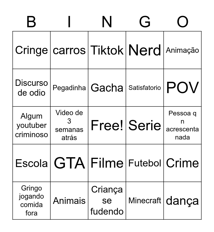 This bingo card has a free space and 24 words: GTA, Animais, Gacha, Gringo jogando comida fora, Animação, Cringe, Discurso de odio, carros, Serie, Filme, Satisfatorio, Algum youtuber criminoso, Futebol, Crime, Pegadinha, Minecraft, Pessoa q n acrescenta nada, Tiktok, POV, Video de 3 semanas atrás, dança, Escola, Nerd and Criança se fudendo.