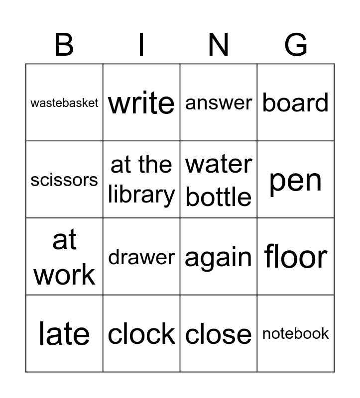 This bingo card has 36 words: glasses, keys, sunglasses, water bottle, eraser, notebook, pen, pencil, scissors, coat, floor, board, chair, clock, drawer, wastebasket, asleep, sick, late, answer, close, listen to, look at, open, read, write, again, at home, at work, at the library, in class, in front of, next to, on the wall, over there and right here.