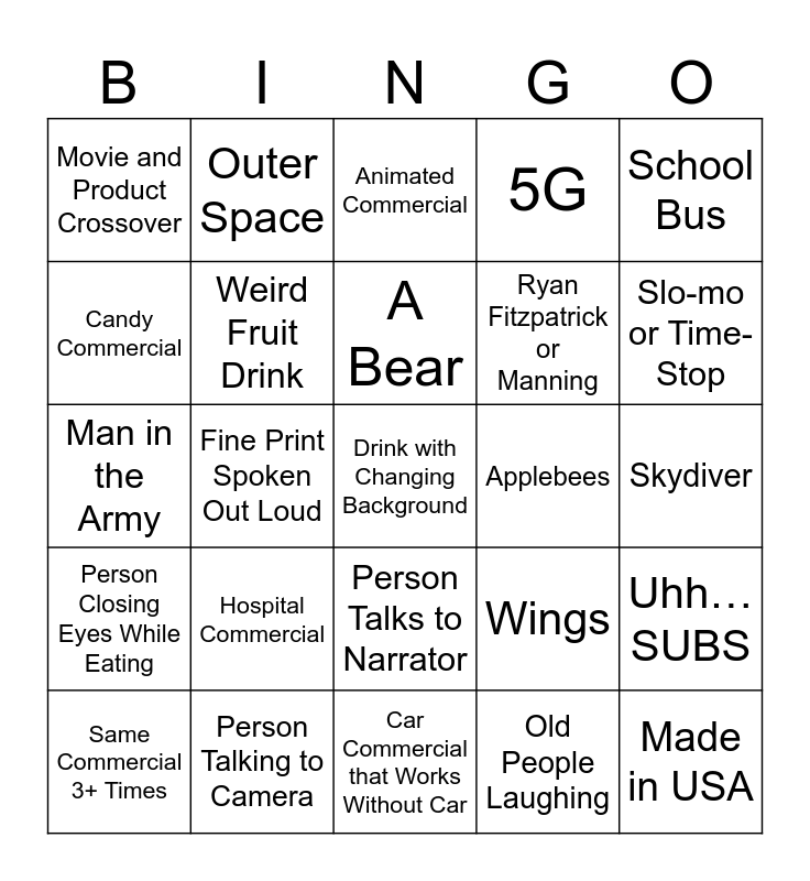 This bingo card has 57 words: Moderate to Severe, Same Commercial 3+ Times, Obscure R-Rated Trailer, Movie and Product Crossover, Car Commercial that Works Without Car, Beer Commercial with Truck, Weird Fruit Drink, NFL Player in Unfunny Commercial, Ryan Fitzpatrick or Manning, Guardians of the Galaxy Song, 5G, AI, Screaming Child, Man and Dog, Zero Words Spoken, Rain or Puddle, School Bus, Fine Print Spoken Out Loud, Hideous, Unusual Outfit, Drink with Changing Background, Applebees, Number 4 Number Food Deal, Wings, Animated Commercial, Falling Food, A Bear, Talking Animal or Animal Mascot, Jewelry Commercial, Slo-mo or Time-Stop, Internal Monologue, Person Playing Instrument, American Flag, Classic Story with Product Placement, Spanish, Skydiver, Candy Commercial, Gaming Controller, Man in the Army, Treadmill, Person Closing Eyes While Eating, Outer Space, Person Talks to Narrator, Made in USA, Celebrity Cameo, Awful Rap, Country Song, Hospital Commercial, Person Talking to Camera, Horrible TV Show, Local Commerical, Food Delivery Service, Old People Laughing, Gambling, 99%, Normal VS Brand, Uhh… SUBS and Horse, But No Bookcase.